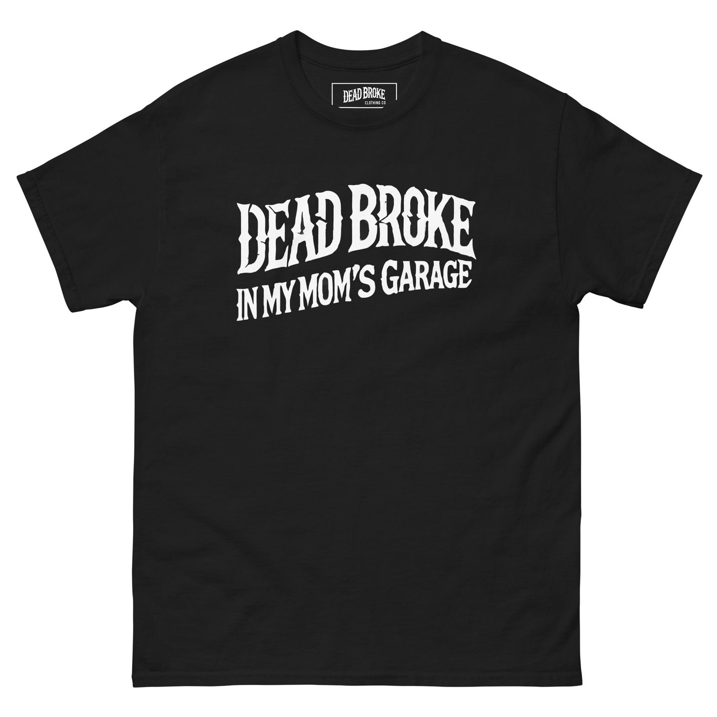 Front print: “Dead Broke In My Mom’s Garage”
